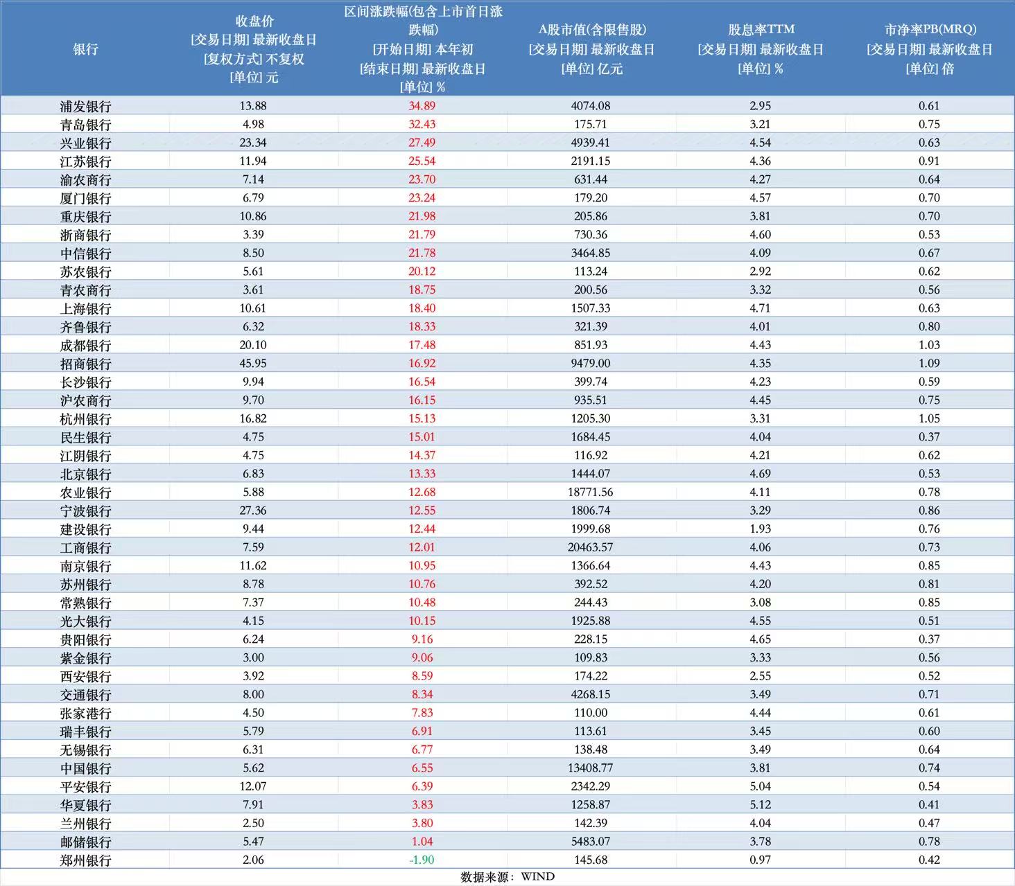 随着A股上半年收官,从“最抗跌”到“最能涨”的银行板块表现也浮出水面——尽管上周五突然转向大跌3%,但银行板块上半年整体涨幅仍在各行业中排在前二位,年初至今涨幅超过13%。板块个股中,有近30只个股涨幅超过10%,其中10只涨幅超过20%,浦发银行、青岛银行则涨超30%。