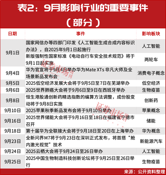 值得一提的是,9月,有多项或对相关行业产生影响的重要事件,涉及人工智能、消费电子、低空经济、创新药、华为等,相关板块不排除或受相关事件的刺激下迎来升温(见表2)。